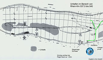 Stromaufwärts fahrend erwartet den Sportbootfahrer ein Felsen mitten im Fahrwasser: die Grünley (markiert durch einen Döpper). Bei normalem Wasserstand dicht unter der Oberfläche ist dieser Felsen kaum auszumachen und hat schon einigen Yachten das Unterwasserschiff poliert. So manch einer hat auch schon mal den kompletten Antrieb verloren.